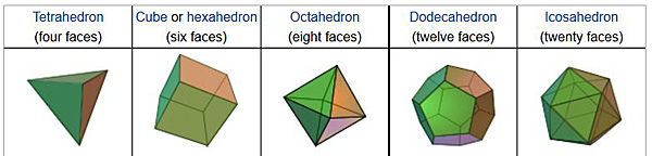 The 5 Platonic solids are the repeating geometric patterns that are the basic building blocks of life. All of life as we know it is composed of these geometric structures: our physical bodies, cells, DNA, plants, animals, minerals, planets, solar systems, stars, and galaxies. The microcosm and macrocosm are endlessly repeating these archetypal patterns. To the Greeks, these solids symbolized fire, earth, air, spirit (or ether) and water.